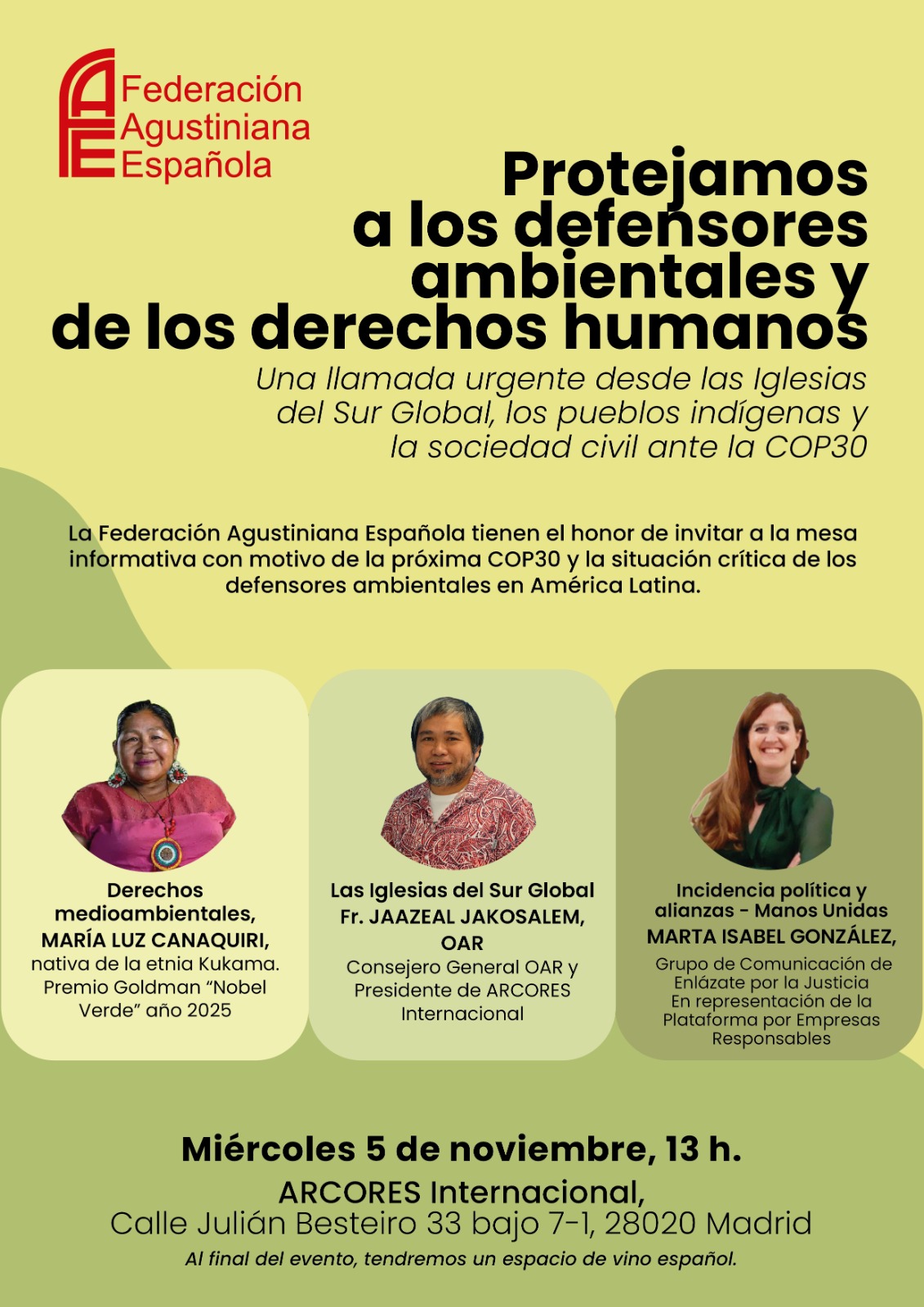 Madrid, 30 de octubre 2025. – ¿Puede una legislación europea ayudar a salvar vidas en la Amazonía? ¿Qué papel juegan las empresas en la defensa del medioambiente y los derechos humanos? A pocos días de la COP30 que se celebrará en Brasil, la Federación Agustiniana Española, FAE Social convoca a los medios a un encuentro informativo el próximo miércoles 5 de noviembre, a las 13:00 h, en la sede de ARCORES Internacional (c/ Julián Besteiro 33, Madrid).