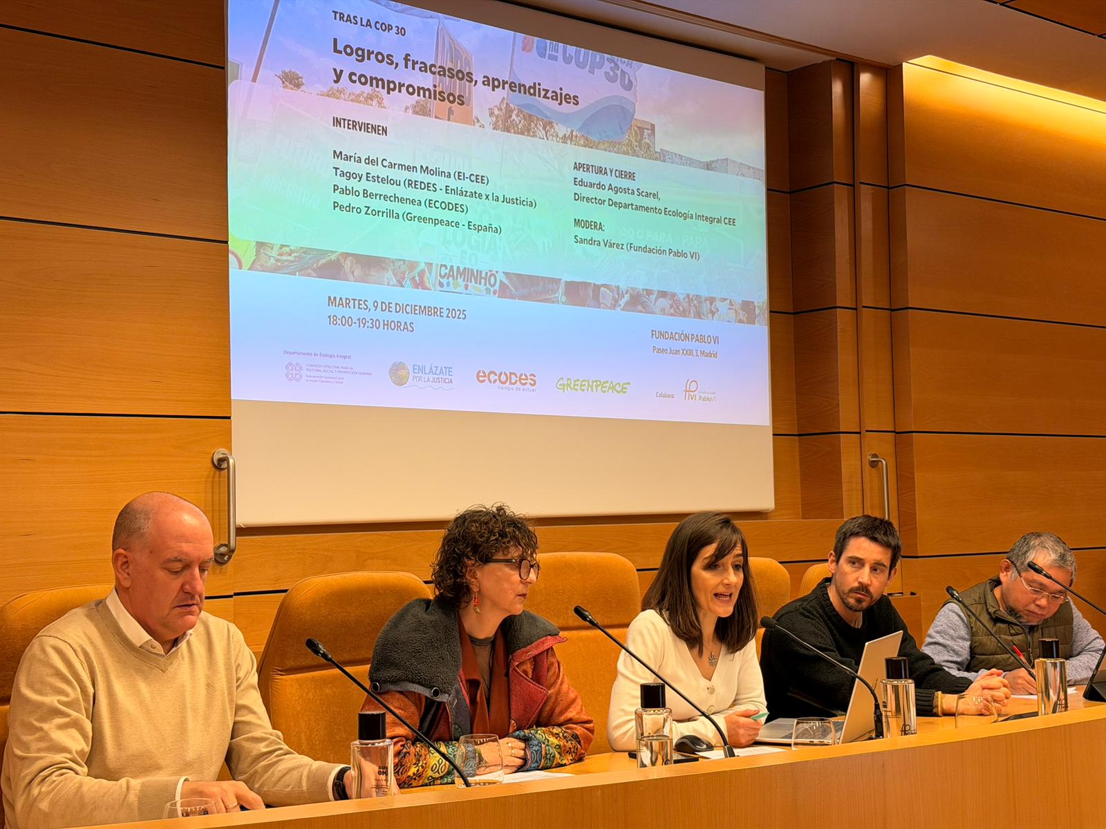 La mesa redonda "Tras la COP30: logros, fracasos, aprendizajes y compromisos", moderada desde la Fundación Pablo VI, reunió a representantes de la Iglesia, ONG internacionales y expertos climáticos para evaluar los avances y límites de la Cumbre. El balance general combinó esperanza y frustración: se reconocieron progresos —mayor presencia de la ciencia, más visibilidad de la sociedad civil y actores no estatales—, pero el texto final fue considerado insuficiente, especialmente por la falta de una hoja de ruta clara para abandonar los combustibles fósiles. Se denunció la influencia de lobbies fósiles y agroindustriales, así como la continuidad de grandes subsidios públicos.