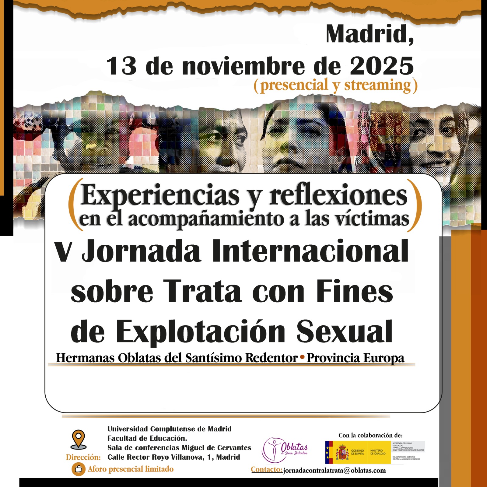 Jornada organizada por las Hermanas Oblatas del Santísimo Redentor, que se centrará en las experiencias del acompañamiento a las víctimas y las reflexiones que surgen en esta labor. La Jornada se celebrará en la sala de conferencias Miguel de Cervantes de la Facultad de Educación de la Universidad Complutense de Madrid, el día 13 de noviembre desde las 10 de la mañana a las 19 h. La jornada también se retransmitirá en streaming, ya que el aforo presencial es limitado.